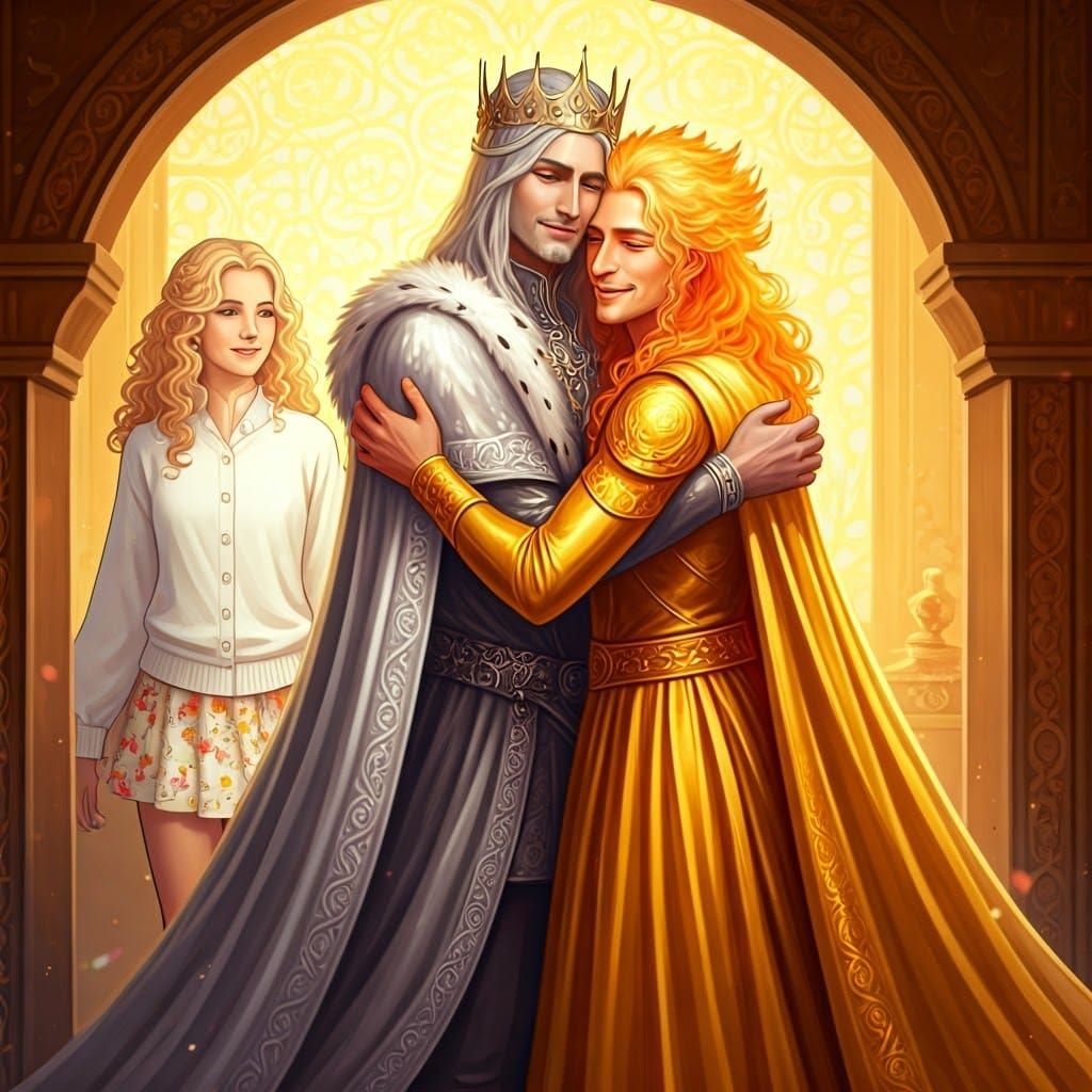 This image shows a vibrant royal celebration scene in the style of Art Nouveau, featuring a majestic silver-haired king and his radiant partner embracing in a heartfelt hug, surrounded by ornate tapestries and candelabras, with subtle hints of fantasy and elegance