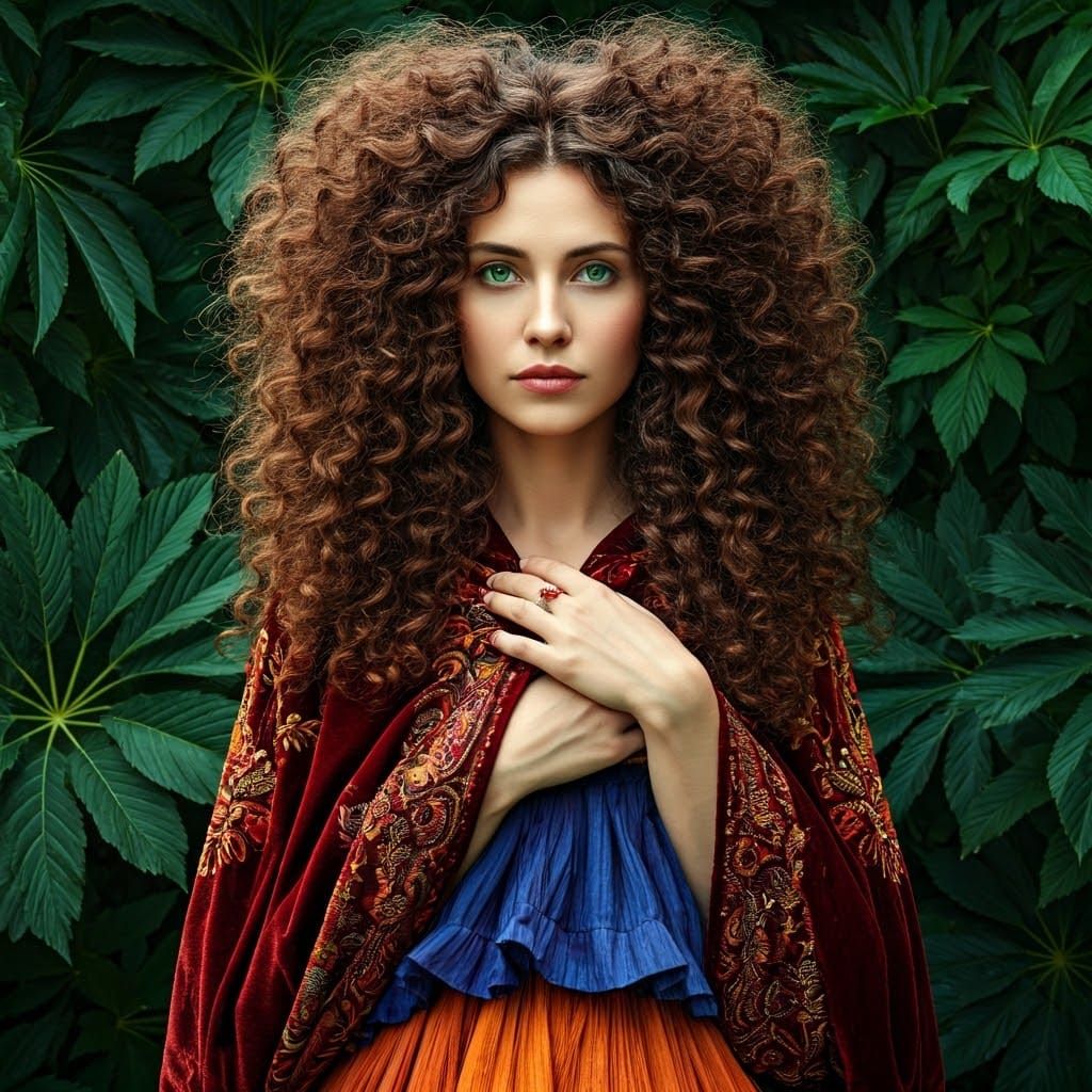 This image depicts a beautiful Gypsy woman with curly brown hair and green eyes, wearing a velvet cloak and layered skirt amidst lush foliage. It captures the romantic aesthetic of Pre-Raphaelite art.