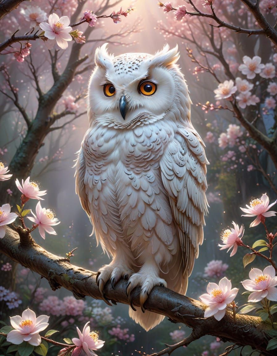 A hyperdetailed oil painting captures a cute white owl on a blossom-laden branch. The enchanting scene features intricate details and soft, dreamy colors reminiscent of divine lighting.