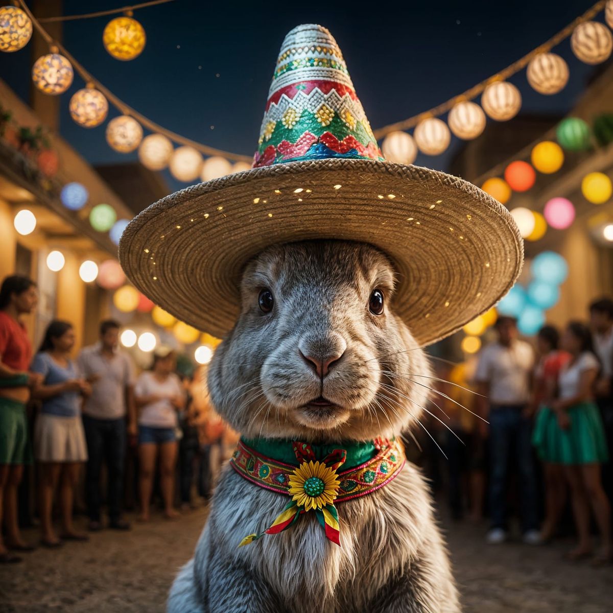 This image depicts a realistic rabbit wearing a sombrero amidst festive decorations in Mexico City. The scene is illuminated with cinematic lighting, creating a vibrant and celebratory atmosphere.