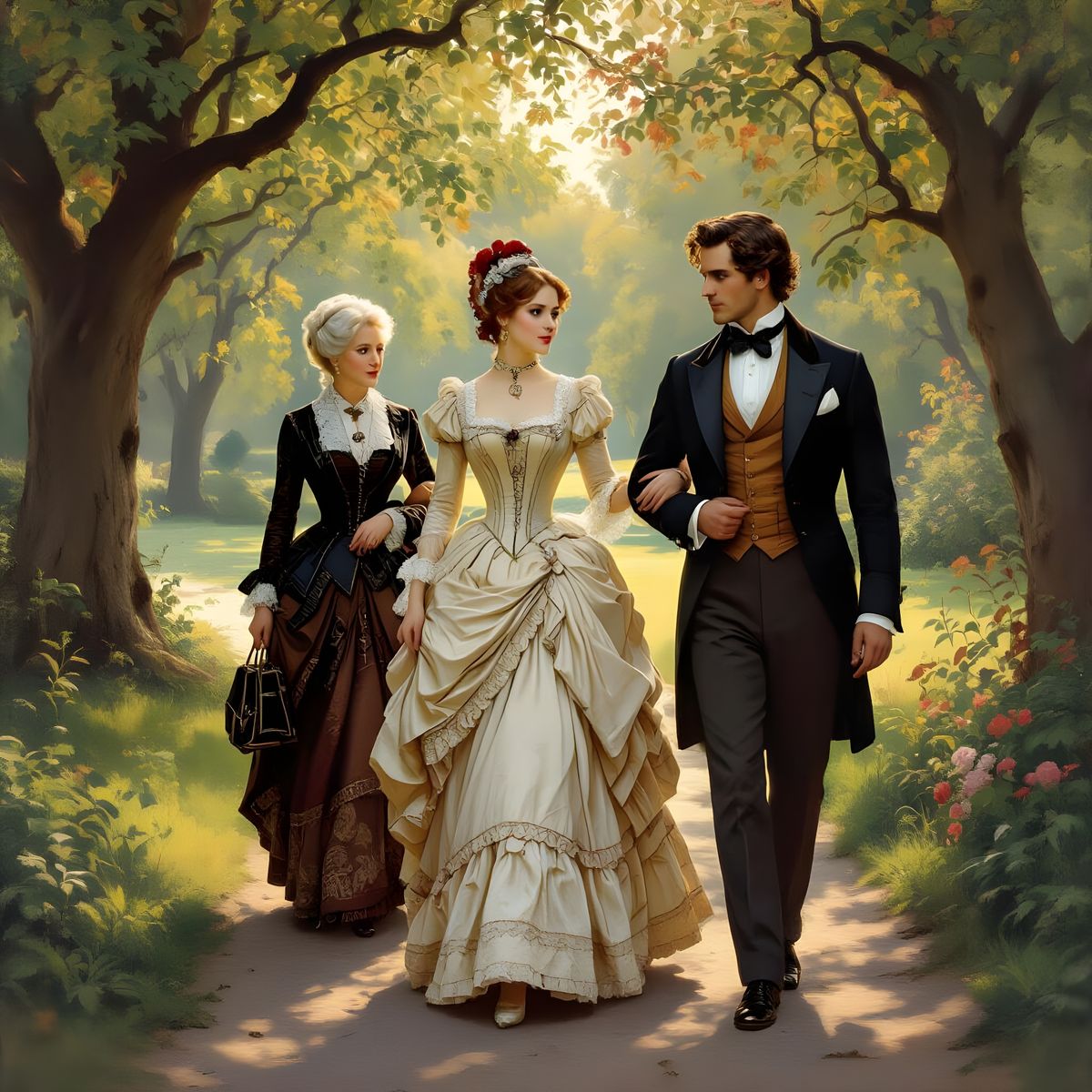 This image depicts a 19th-century lady in high fashion, accompanied by her mother, as they walk through a park with her beau. Both are dressed in period attire.