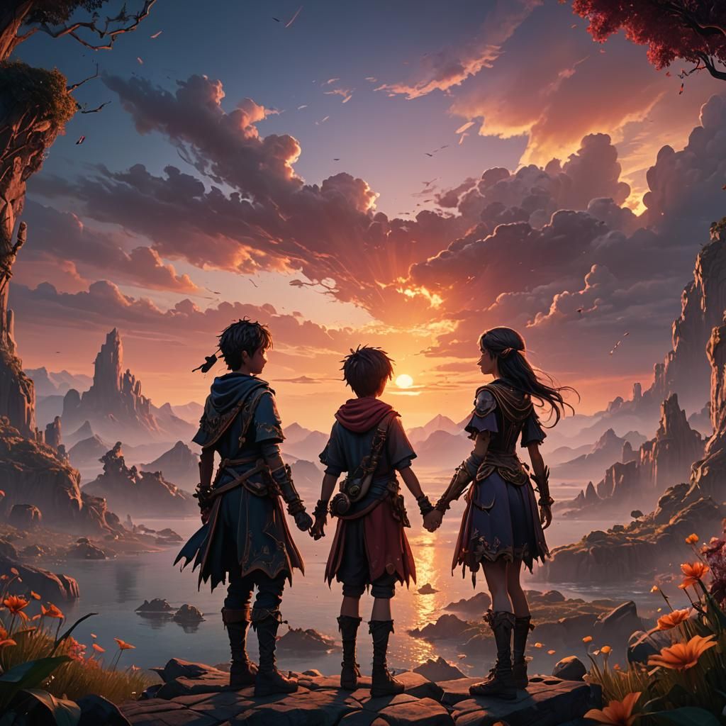 This image shows a boy and girl silhouetted against a vibrant sunset. The scene has the rich colors and intricate detail of a fantasy concept art piece.
