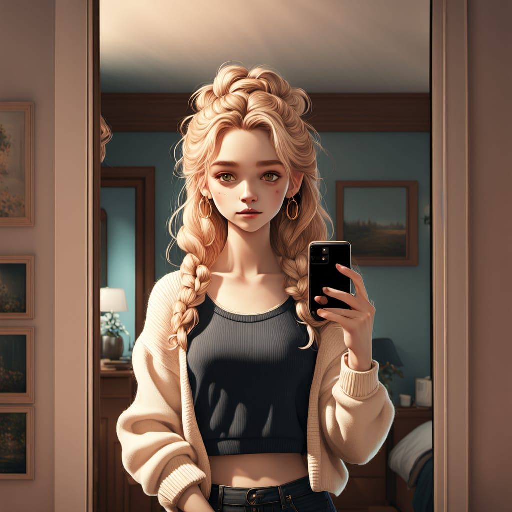 This image is a beautifully rendered pencil drawing of a 15-year-old girl taking a mirror selfie in her bedroom, surrounded by artistic touches and a peaceful ambiance.