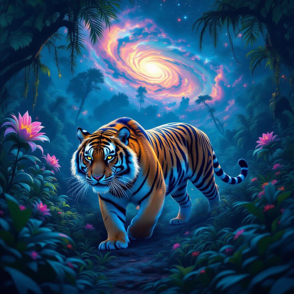 A majestic tiger with glowing stripes walks through an alien jungle filled with giant luminous plants, under a sky of swirling nebulae. Rendered in a hyperrealistic digital art style with vibrant colors and intricate details.