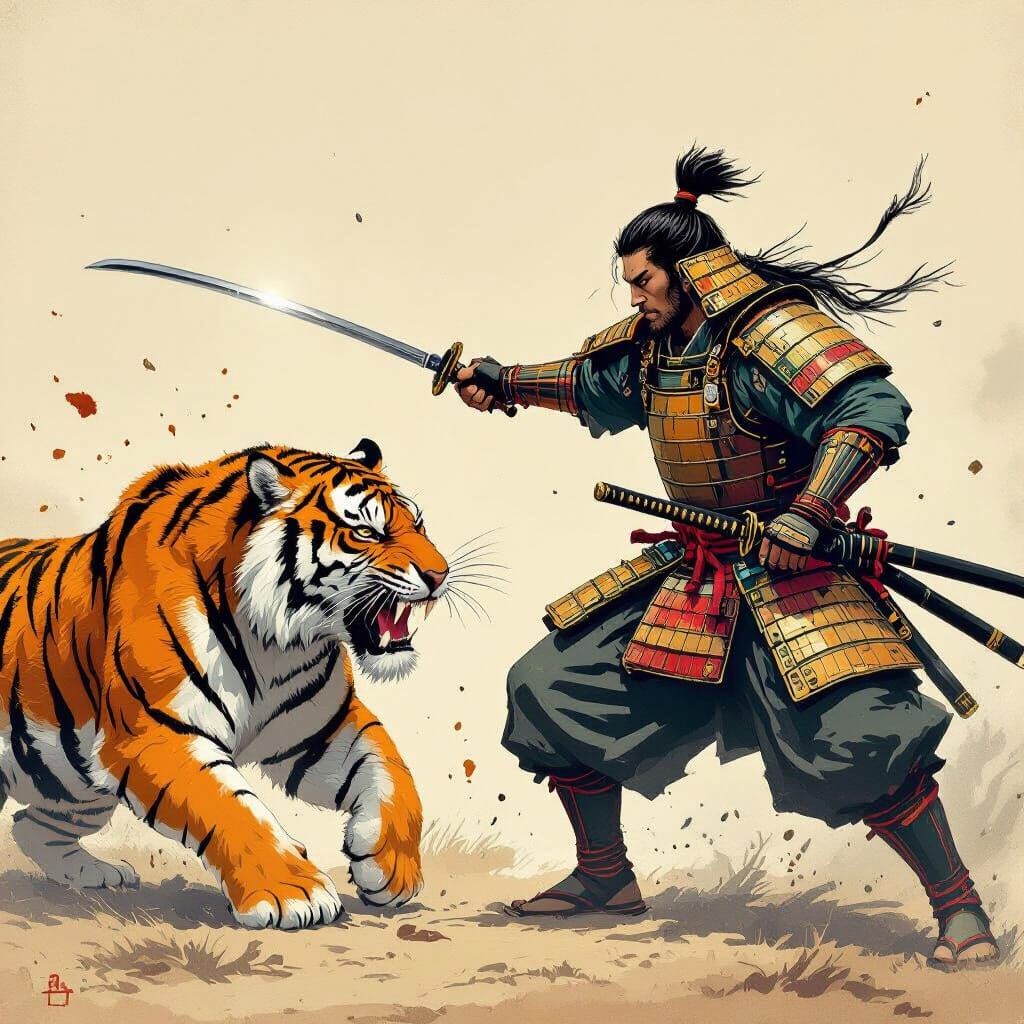 This image shows a samurai in traditional armor fiercely battling a tiger, wielding a katana. The artwork blends realism with dramatic intensity and detailed texture, as a digital painting.