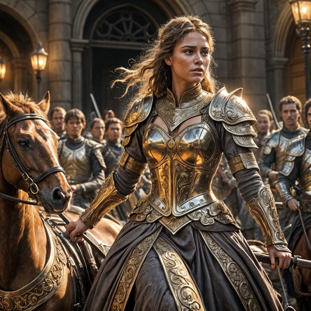This image shows a beautiful warrior princess with curly brown hair standing on a wooden carriage. She holds a sparkling sword, looking determined as guards surround her.