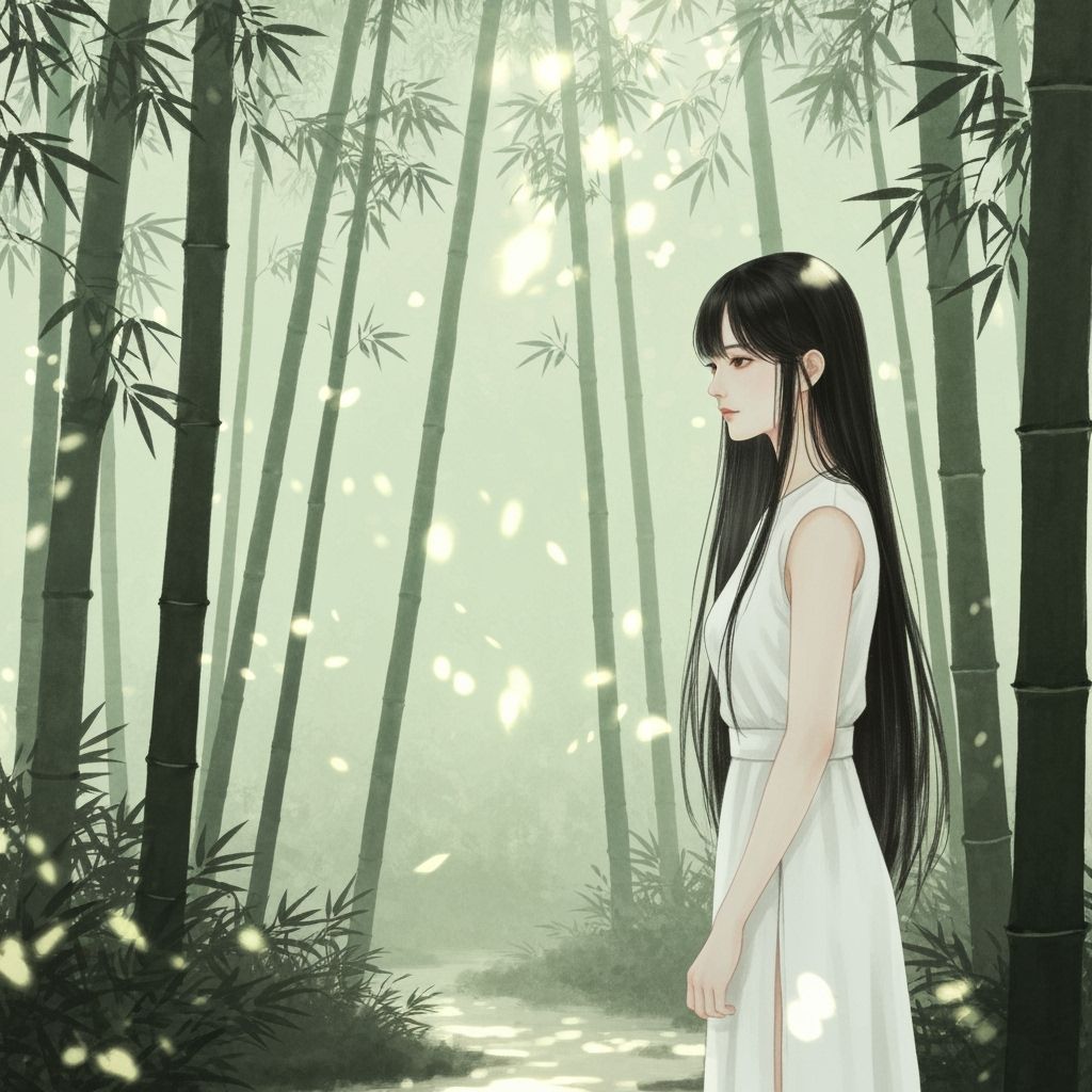 This image shows a woman in a bamboo forest, bathed in dappled sunlight. The art style evokes traditional Chinese ink wash painting with soft tones and delicate brushstrokes.