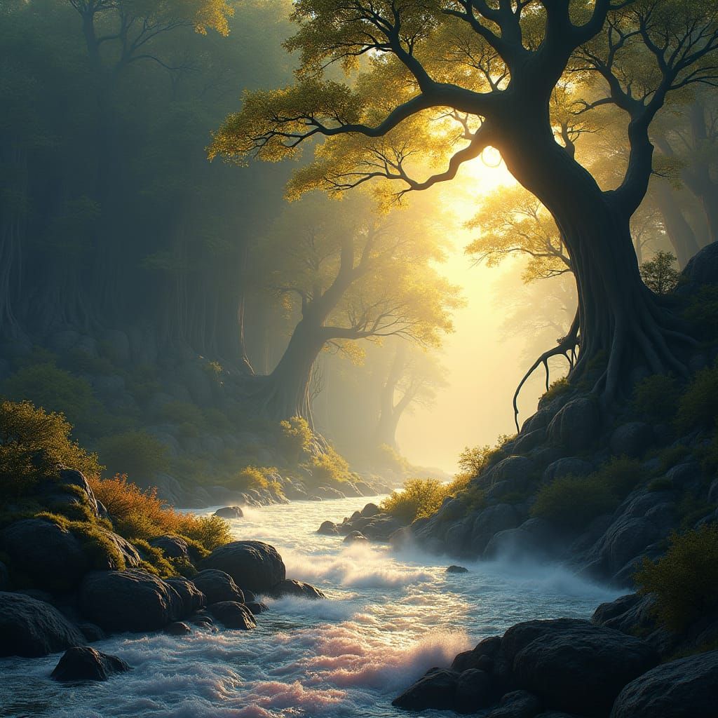 A vibrant clearing featuring a river with crystal-clear water. A dense forest rises on the opposite bank. This dark fantasy concept art features volumetric lighting and rich, deep colors.