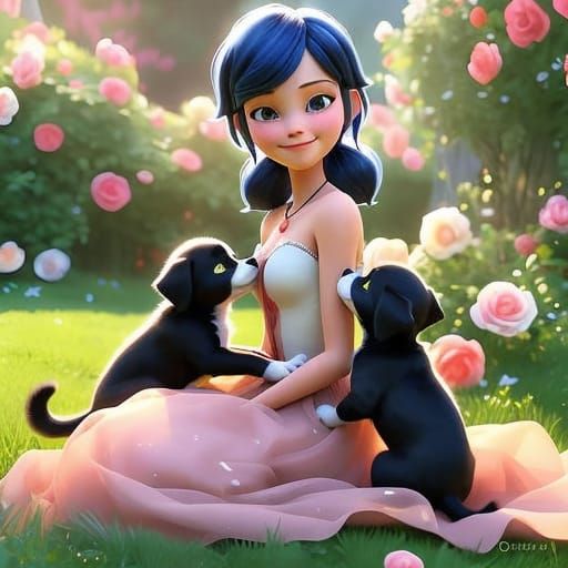 This image shows a realistic portrait of Marinette Dupain-Cheng with dark-blue hair, wearing a gown while sitting on green grass with puppies. Warm sunlight illuminates her face in this photographic style image.