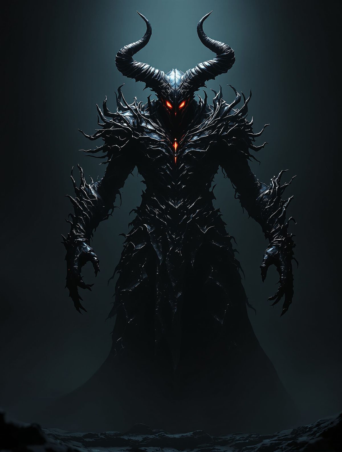 A terrifying Demon Warlord with glowing crimson eyes stands in a dark void, adorned in twisted armor. Rendered with dramatic lighting, the image evokes dread and immense infernal presence.