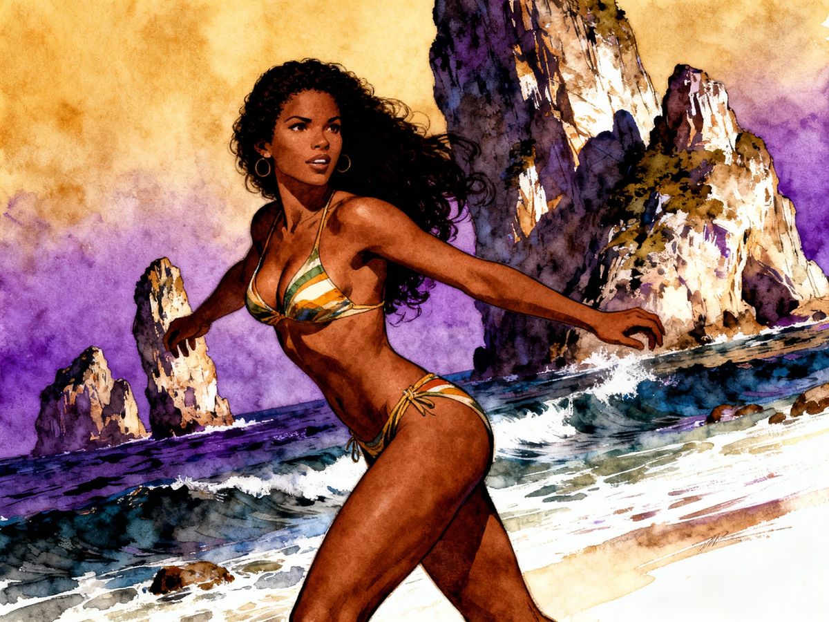 storytelling, color wash by Terry Bradshaw, illustration, storytelling, (dramatic angle, dynamic angle, dynamic pose:1.3) directional illumination, textured depiction of brown brazilian girl, with complementary amber, ultraviolet and infrared hues :: seastacks, coastal setting, Lovely, dynamic, cool(Alluring ...