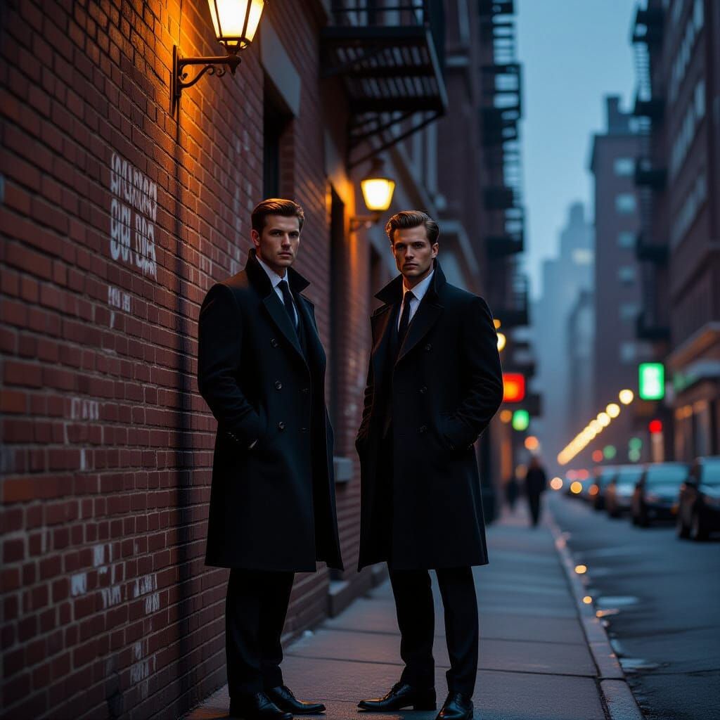 A nighttime street scene in New York with two men standing before a worn brick wall. A fire escape and cold streetlamp lighting add to the cinematic, photorealistic aesthetic.