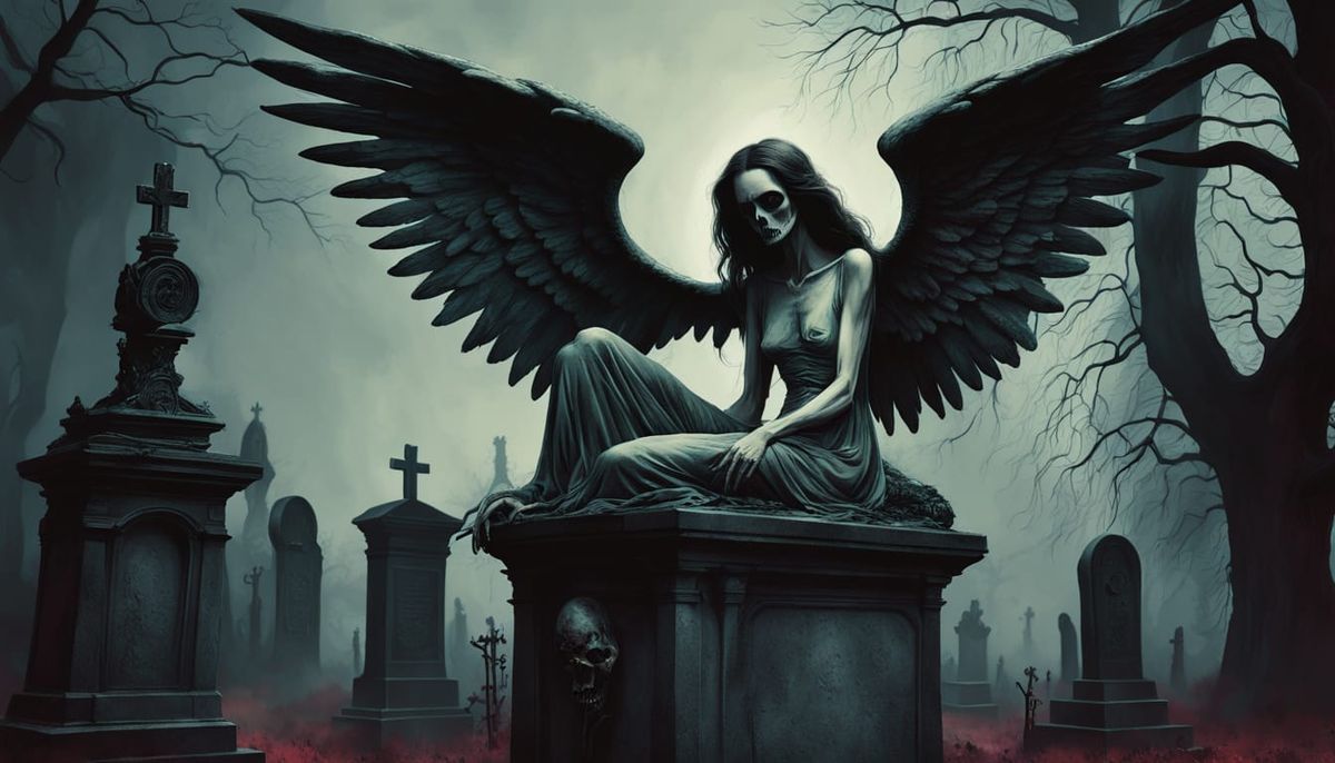 A haunting image of the Angel of Death in a Victorian cemetery. The oil on canvas artwork features a dark, macabre scene reminiscent of early 20th-century horror with surreal and eerie qualities.