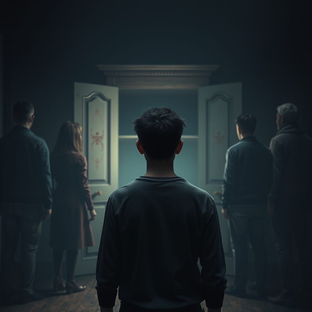 This haunting image captures a moment of isolation and abandonment. A young man stands alone in a dimly lit room, surrounded by the cold, expressionless faces of his loved ones, their backs turned in a poignant display of rejection and disconnection.