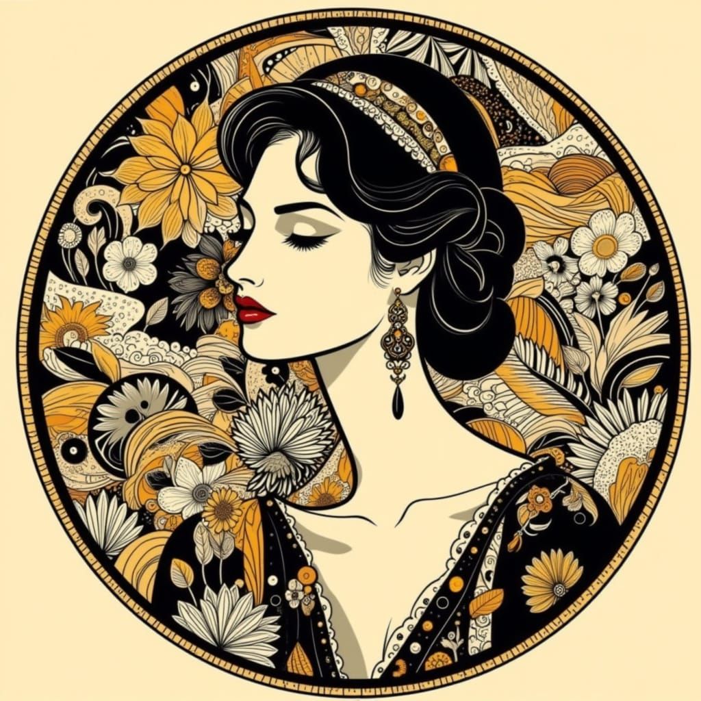 An elegant woman in vintage 1920s fashion, adorned with ornate jewelry, stands amidst stylized floral and geometric patterns. Rendered in a bold black and cream palette with clean lines and graphic illustration style.