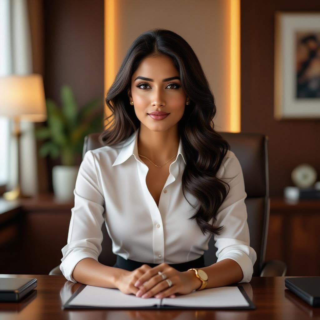 This image shows an Indian woman in her mid-20s in a modern office setting. The artwork evokes the style of Alphonse Mucha, Ash Thorp, and Simon Stalenhag with warm, cinematic lighting.