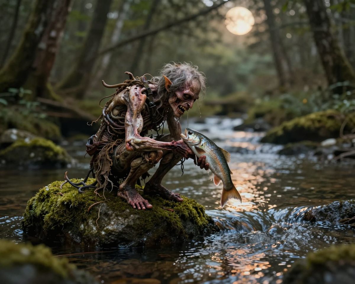 This hyperrealistic image shows a tiny, gnarled woodland man triumphantly holding a fish on a mossy rock in a river. Moon glow reflects in the water, creating a warm, surreal light with soft focus.