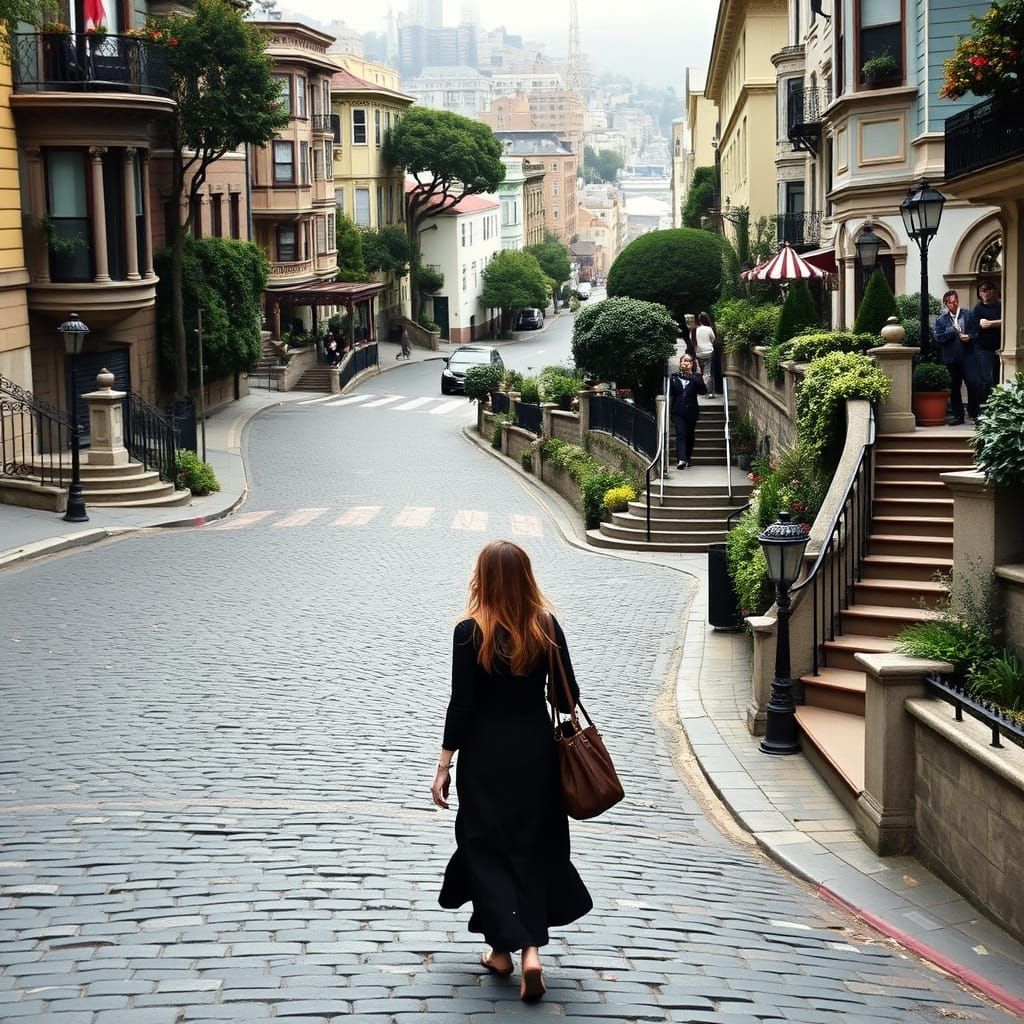 This image shows a woman strolling down a winding, cobblestone road in San Francisco, with lush greenery and vibrant colors reminiscent of Impressionist art.