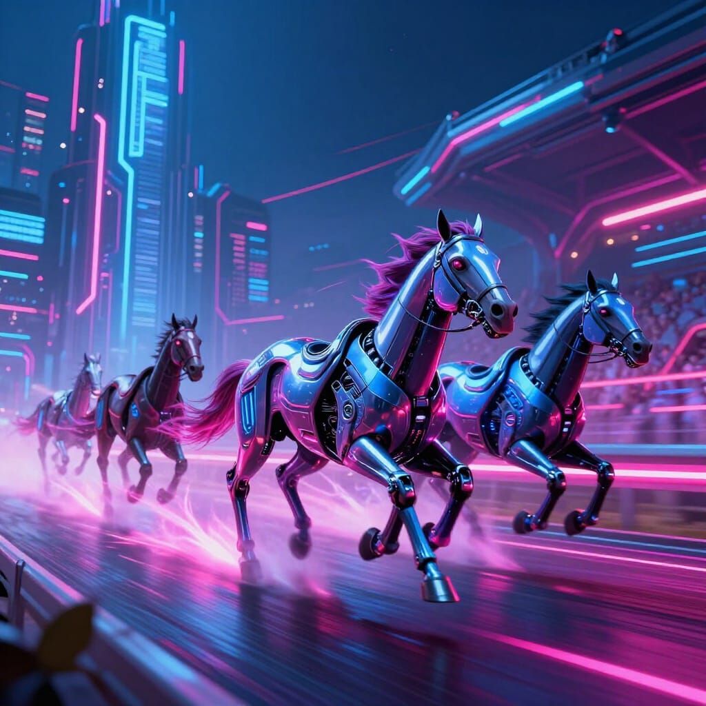 This image shows cybernetic horses racing on a neon-lit track. The artwork blends cyberpunk concept art with cinematic digital painting, featuring vibrant colors and dramatic lighting.