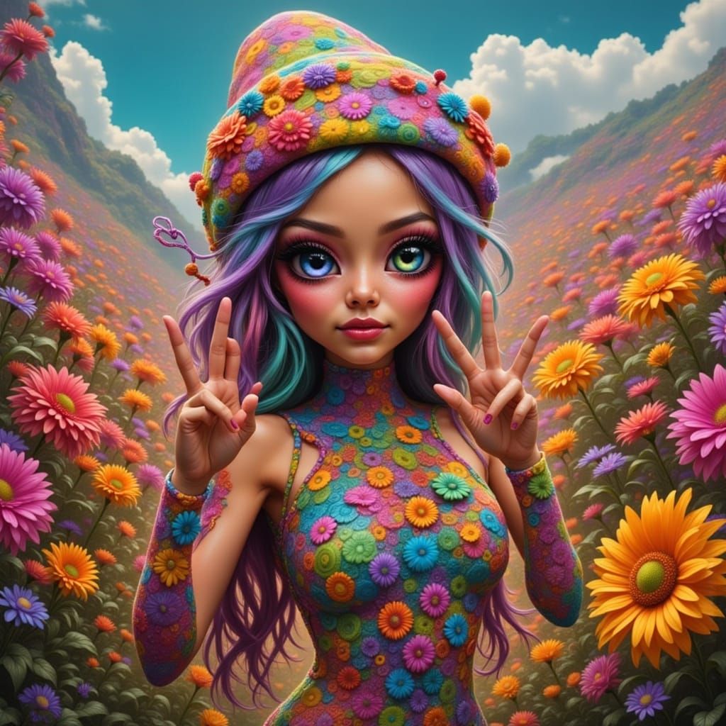 This image shows a psychedelic alien standing in a field of colorful flowers, holding up a peace sign. The artwork has a fun-loving, vibrant aesthetic.