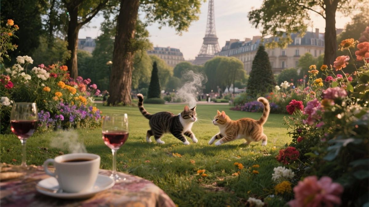 This image shows cats playing in a park with flowers and trees. The cinematic image is reminiscent of a vintage film still with film grain and dramatic lighting.