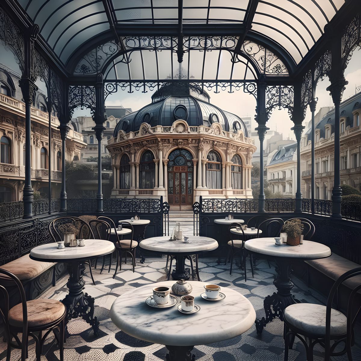 This image shows a Belle Epoque winter garden in Bucharest. Delicate marble tables sit on a black iron patio, with antique landmarks subtly visible. The Ateneum rooftop terrace is framed by the opulent surroundings.