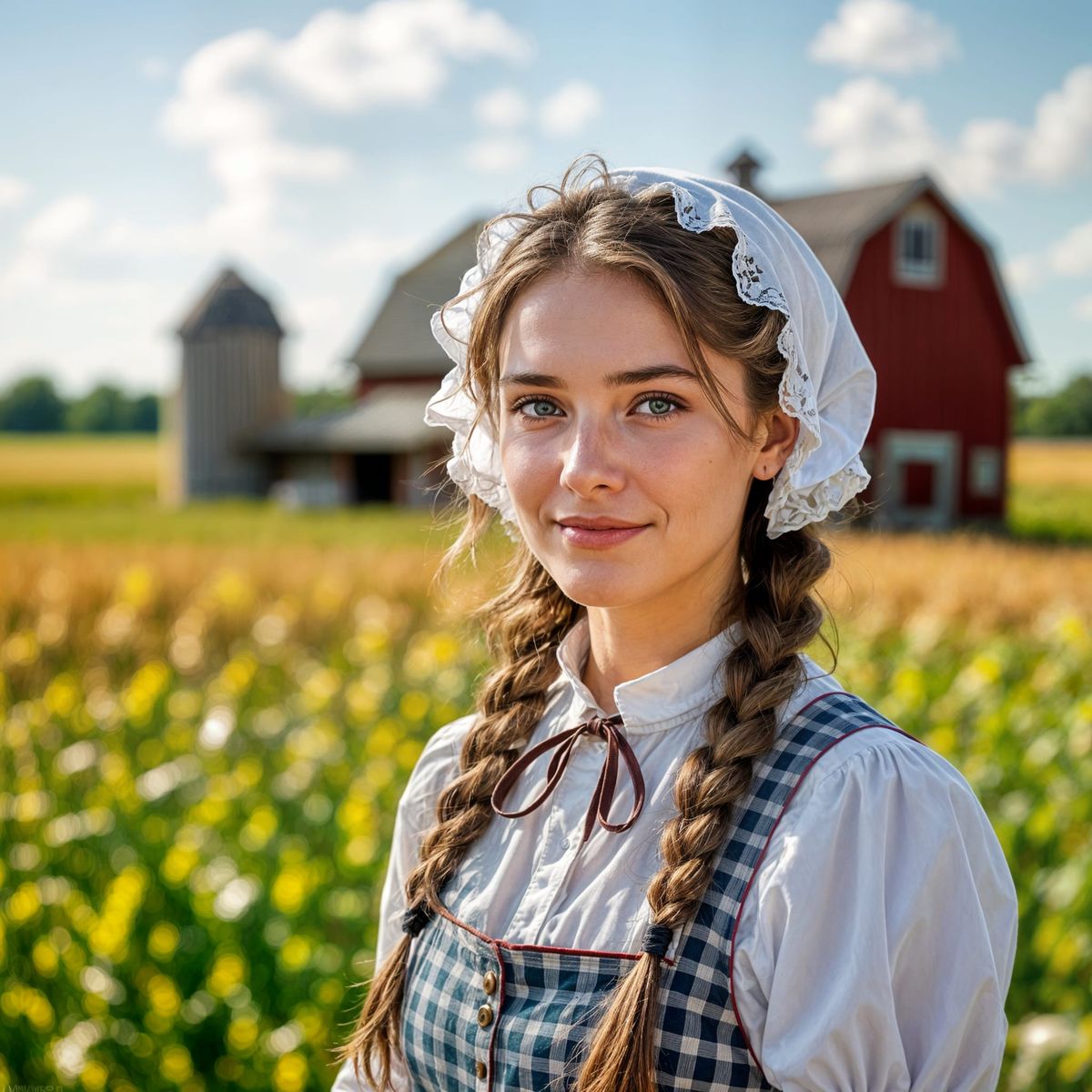 A striking close-up portrait of an Amish woman set against a classic rural backdrop. The image captures a professional photography style with soft bokeh and sharp focus.