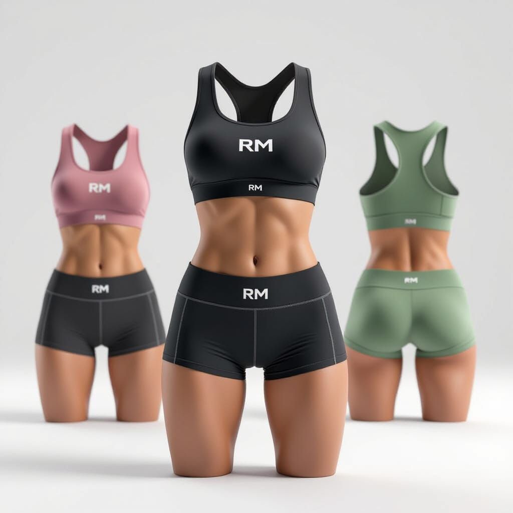 This image showcases a women's activewear set with a sports bra and high-rise shorts. The apparel, in matte black, dusty rose, and sage green, is presented with front and back views, rendered as futuristic 3D art.