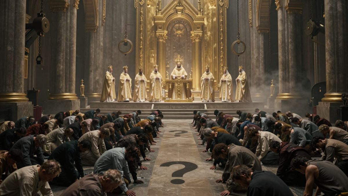 This image shows a hyper-detailed, ultra-realistic cinematic scene of a vast cathedral-palace interior designed to enforce obedience. Elevated figures observe as masses below bow in perfect symmetry.