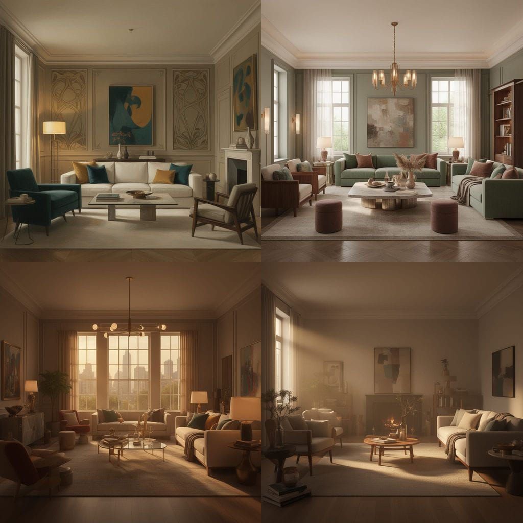 Easily generate your own living room images with AI, blending modern, mid-century, and traditional styles.