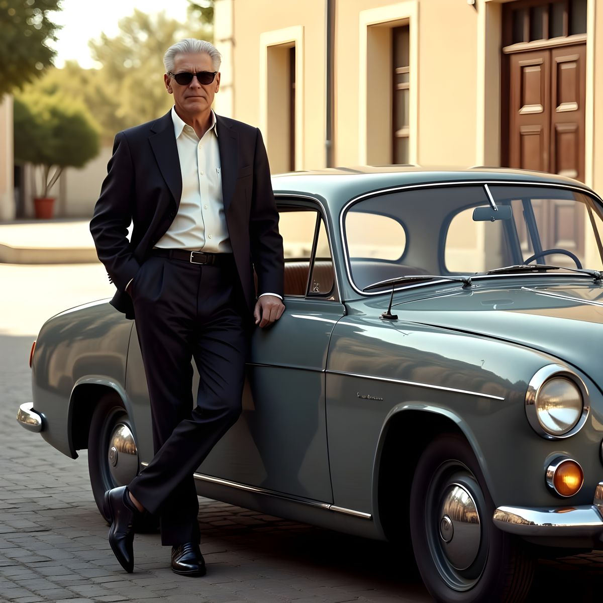 This classic photo captures a mature man standing beside a vintage dark gray Lancia Appia car, set against a warm and sunny backdrop of light beige buildings, emphasizing the car's smooth textures and classic design.