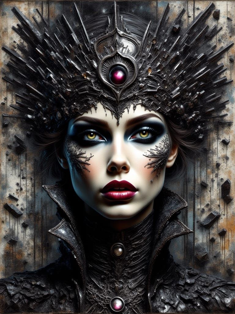 This striking image features an ultra-detailed geometric mixed-media collage of a queen with a crown of blackened foil and bone. A high-fashion gothic aesthetic with cinematic lighting.