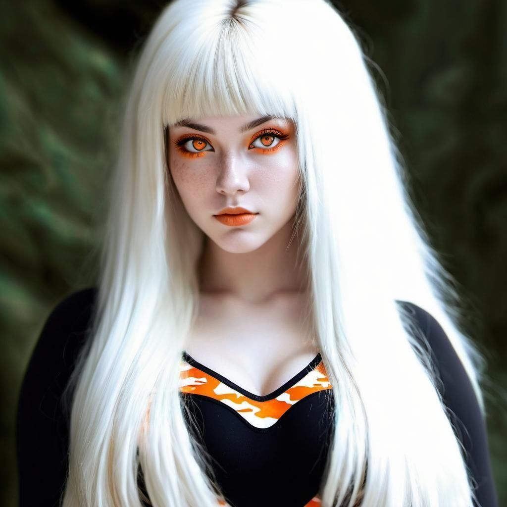 This image shows a gorgeous teenage girl from Venus in a futuristic orange camouflage suit. The background features the thick, hazy, sulphuric atmosphere of Venus.