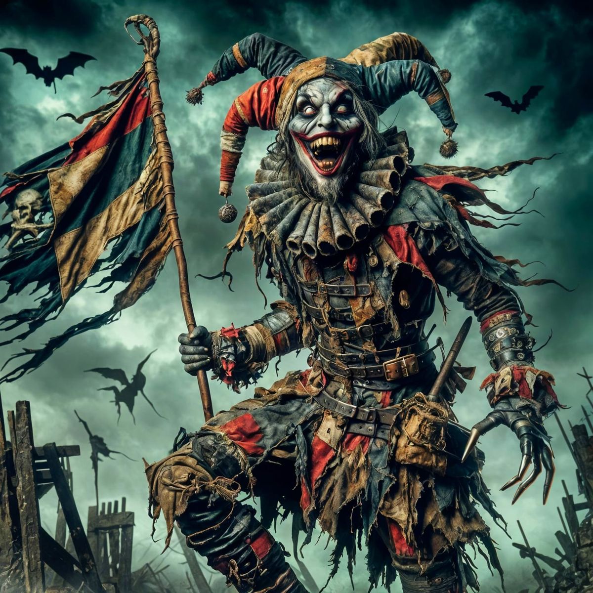 A striking picture of a chaotic jester figure with smeared makeup and a chilling grin, set against a desolate battlefield. The character, inspired by Viking and medieval themes, is rendered in a dark, vintage comic style.