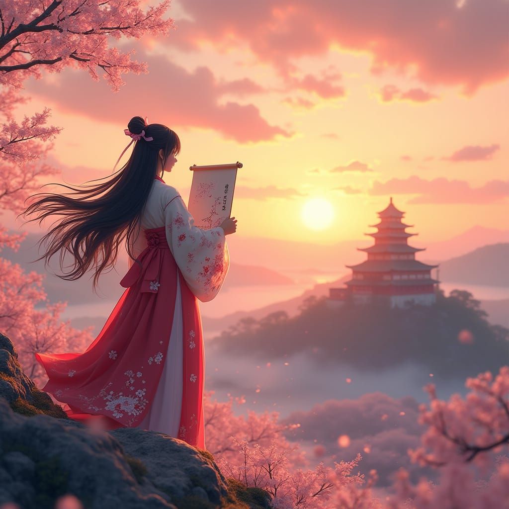 This image shows a detailed 3D anime style artwork of a Joseon woman in a floral hanbok painting a distant castle at sunset, with cherry blossoms floating.