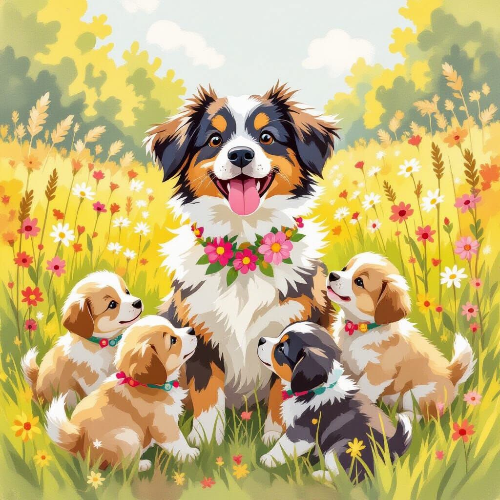 This image shows a mother dog with a floral collar, lovingly surrounded by her playful puppies in a sunny meadow. The picture has a soft watercolor aesthetic and intricate textures.