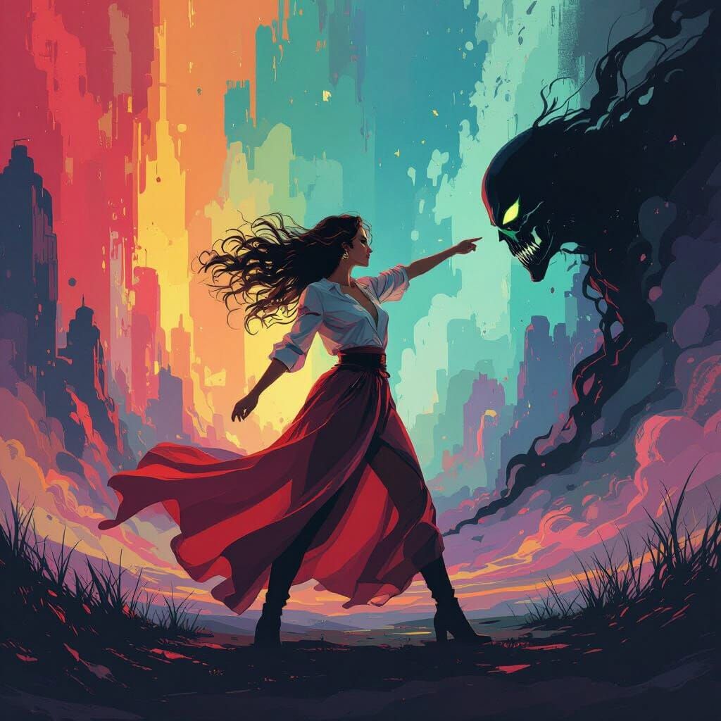 A striking picture of a woman battling death amidst a surreal backdrop. The scene blends bold color fields with futuristic, neon-lit aesthetics, creating a dreamlike and courageous depiction.