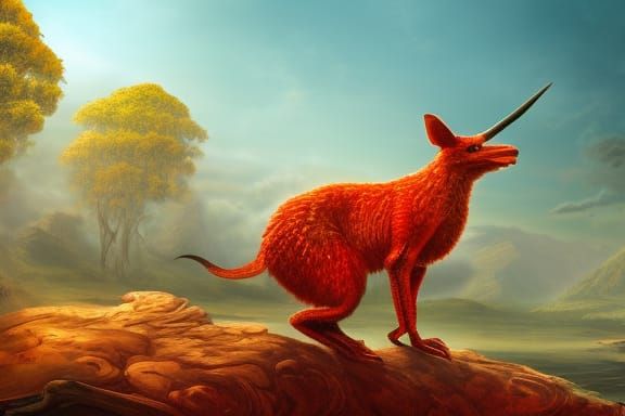 This image shows a detailed matte painting of a red and orange kangaroo in the Australian outback. The fantasy concept art features deep colors and complementary tones in 8k resolution.