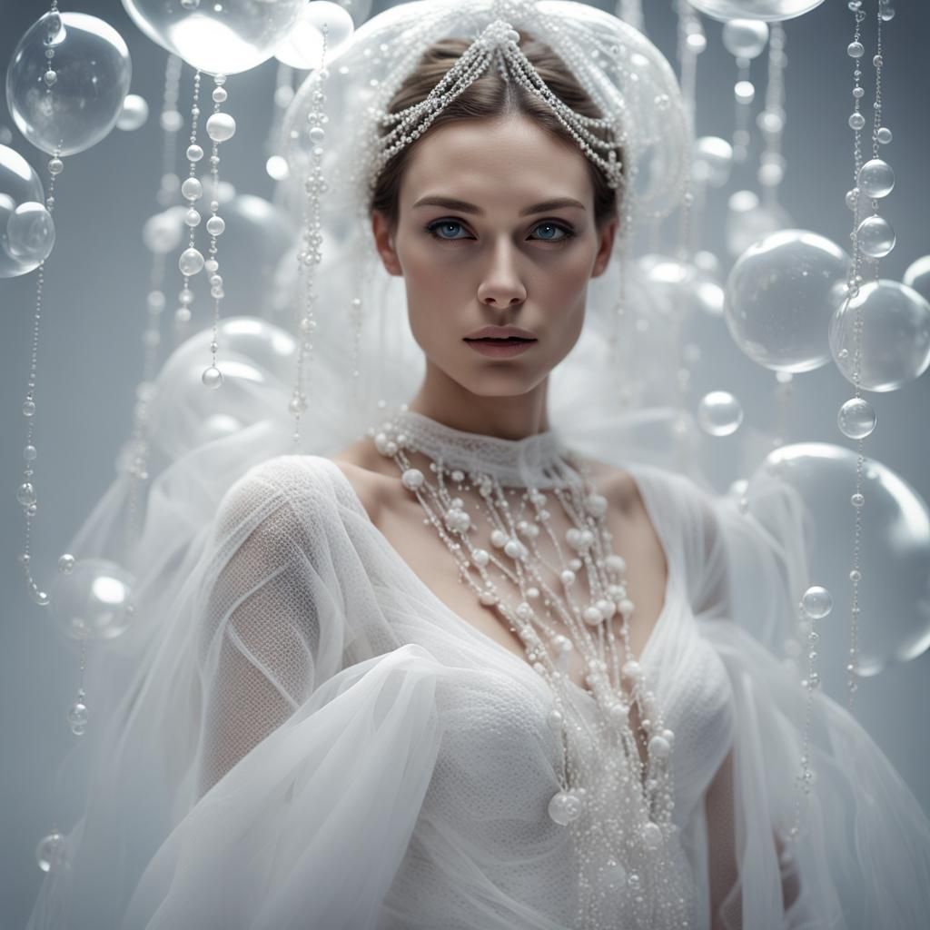 A beautiful woman in white gazes at the viewer. The ethereal image features intricate design, a bubble background, and white cloth decorations, resembling high-fashion photography.