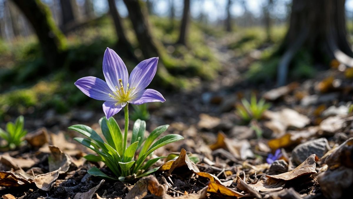 This image captures the delicate, star-shaped flowers of Scilla bifolia, a rare and charming spring-blooming plant, set against the backdrop of a forest floor. Its vibrant blue-purple hues illuminate the forest before the trees' leaves emerge.