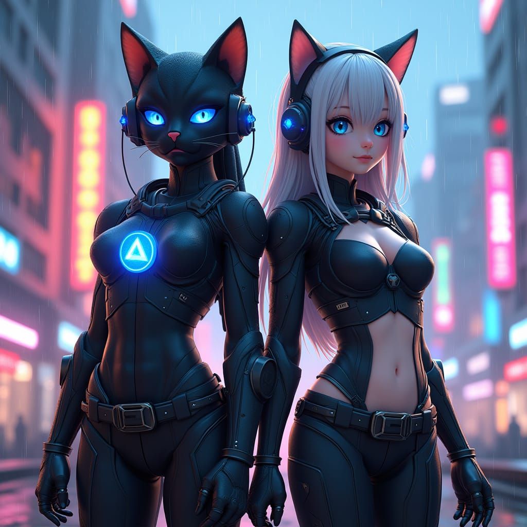 This image shows an anthropomorphic black cat and anime girl in futuristic armor, posing heroically on a neon-lit rooftop. The artwork is rendered in a detailed, photo-realistic 3D style.