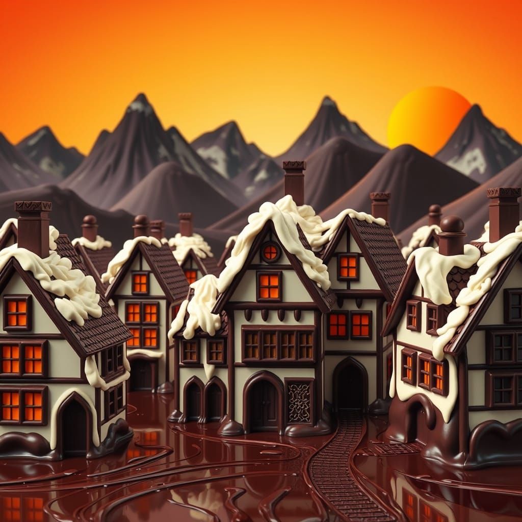 A surreal candy town featuring melting Tudor houses crafted from chocolate and cream. Mountains of dark chocolate melt under a vibrant orange sun, reminiscent of surrealist painting.