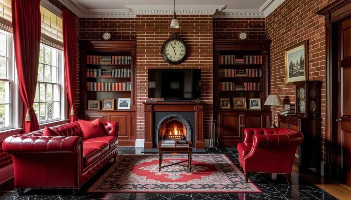 This image shows a wide-angle view of a Victorian living room featuring a red leather sofa, armchair, and fireplace. Sunlight illuminates vintage decor and a central TV, with brick wallpaper and a black marble floor.