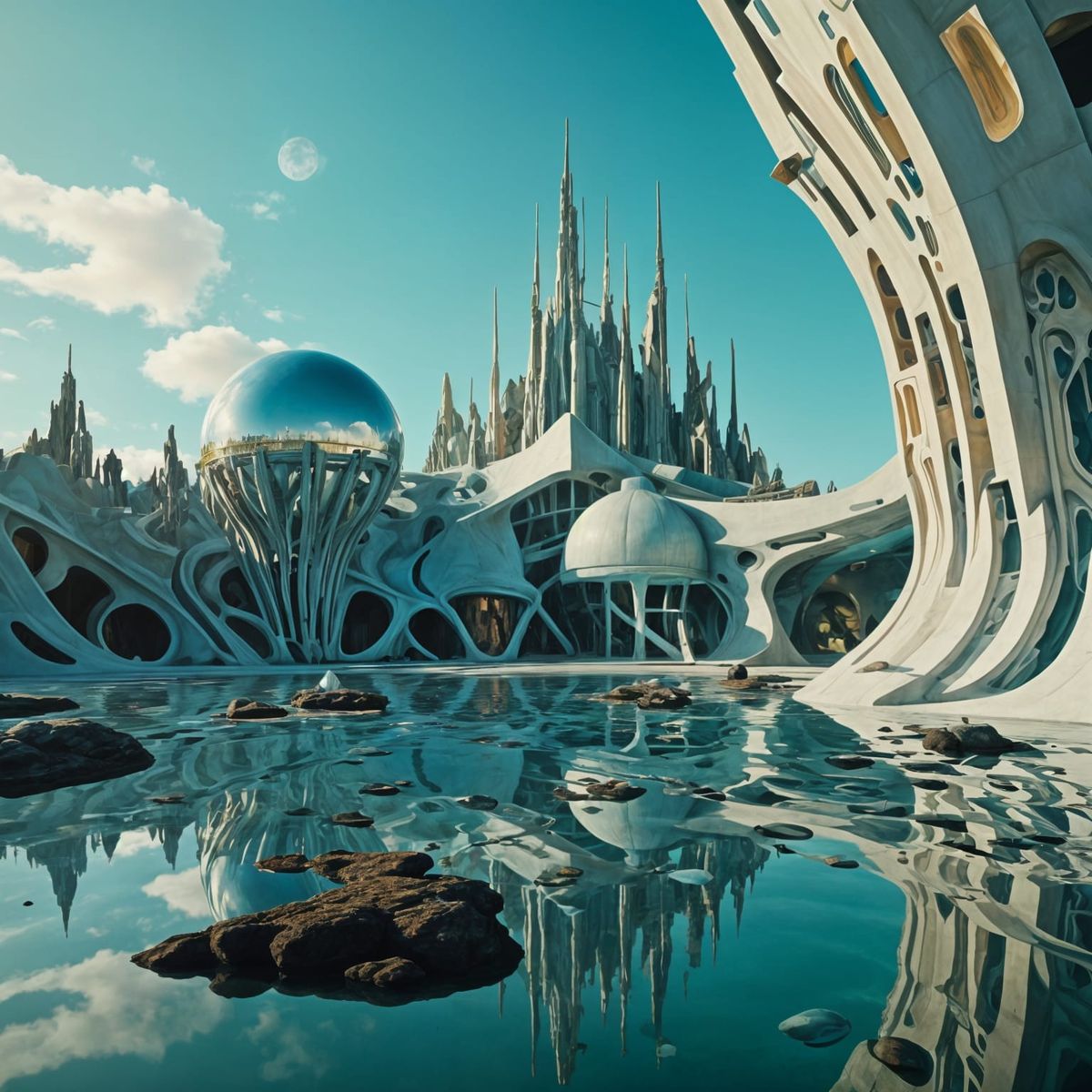 This image shows a surreal artwork blending abstract shapes with dreamlike landscapes. Futuristic architecture merges with nature in a playful, experimental scene with vibrant colors and cinematic lighting.