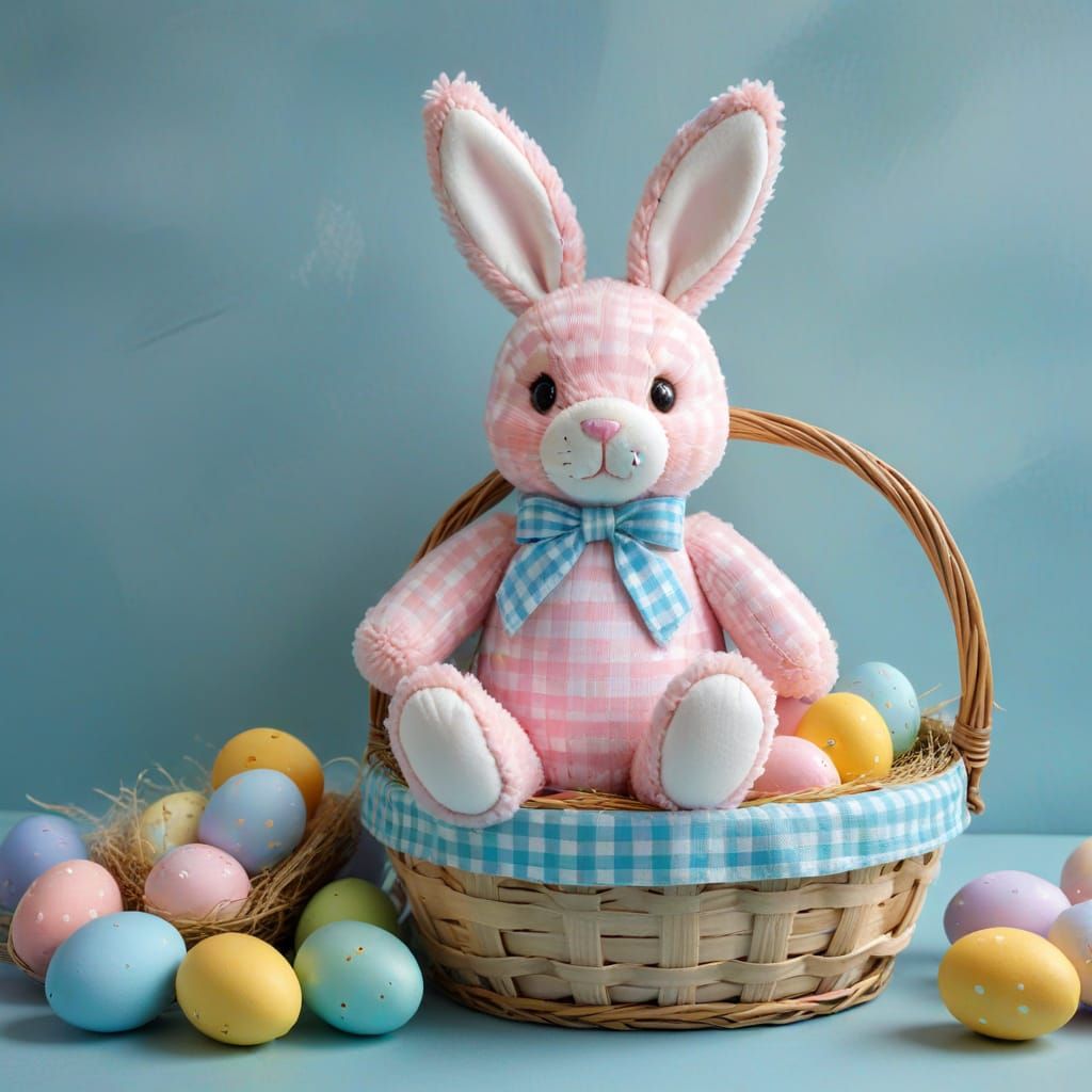 A playful image of a stuffed bunny crafted from pastel gingham fabric, surrounded by colorful Easter eggs in a woven basket, evoking a sense of springtime joy and festive cheer.