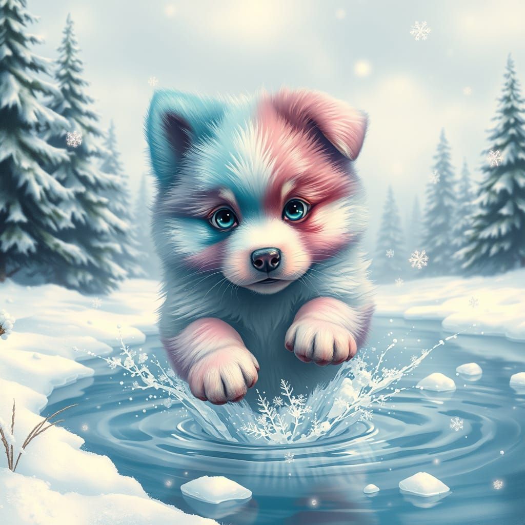 A vibrant image of a multicolored puppy leaping from an icy pond into a winter scene. This picture features soft pastel colors, intricate details, and a whimsical style.