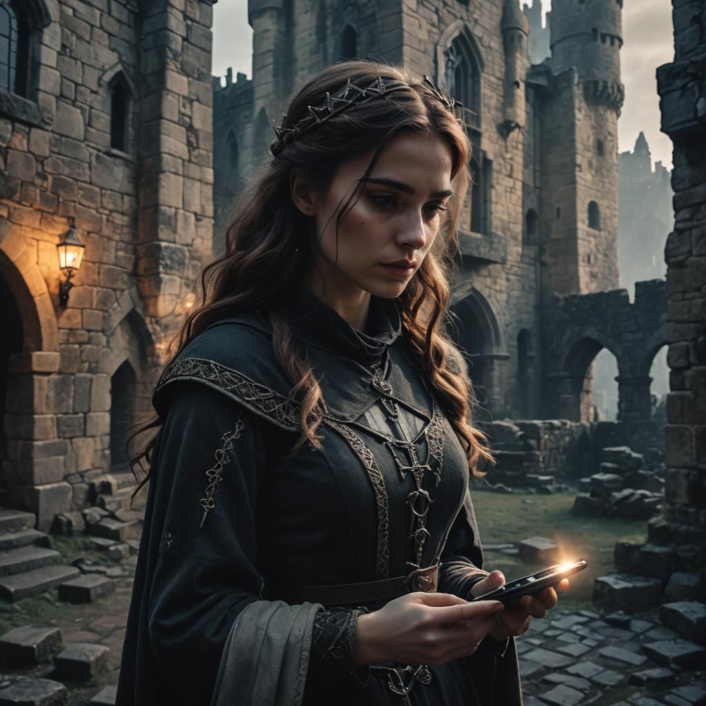 This image depicts a medieval girl in dimly lit castle ruins holding a smartphone. The cinematic film-noir scene features a monochromatic palette with a warm glow on her fingers, enhanced by film grain and impressive depth of field.