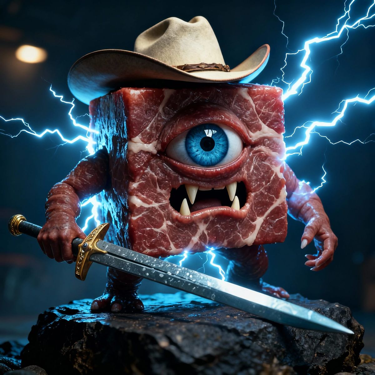 This hyperrealistic image shows a meat cube with a human eye and mouth, wearing a cowboy hat and holding a sword, radiating lightning.