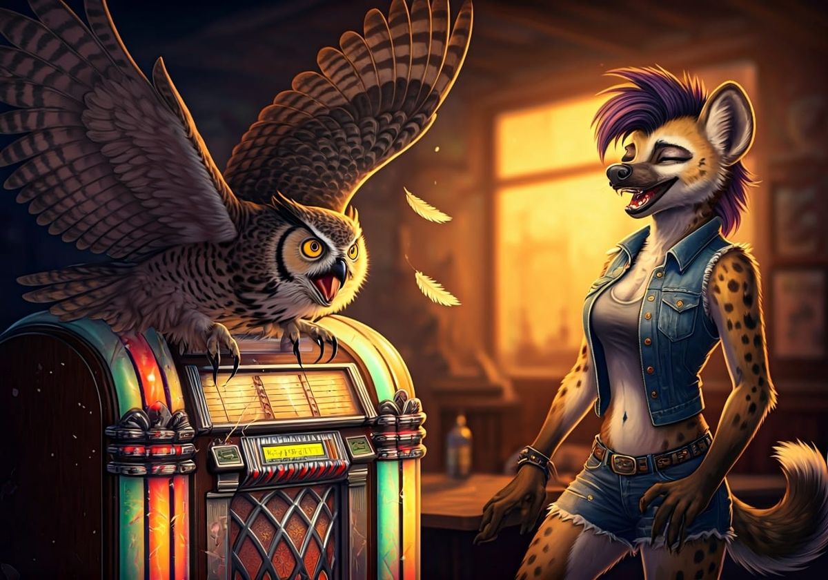 A surreal scene in a dimly lit bar features an owl landing on a jukebox. In the style of gritty realism with a chiaroscuro effect, a hyena laughs in the background.