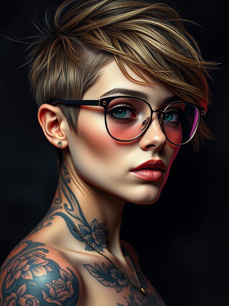 This image shows a detailed portrait of a young woman with tattoos and sunglasses against a dark backdrop. The artwork features chiaroscuro lighting and a composition that follows the golden ratio in a photorealistic style.